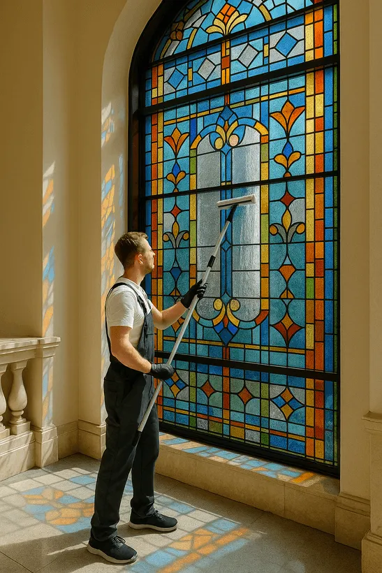 Стекло с обеих сторон моется профессиональной химией, уничтожающей жир и въевшуюся грязь. Ключевой этап — ополаскивание дистиллированной водой. Это гарантирует отсутствие разводов, так как в такой воде нет солей и примесей, которые остаются после высыхания обычной водопроводной воды.