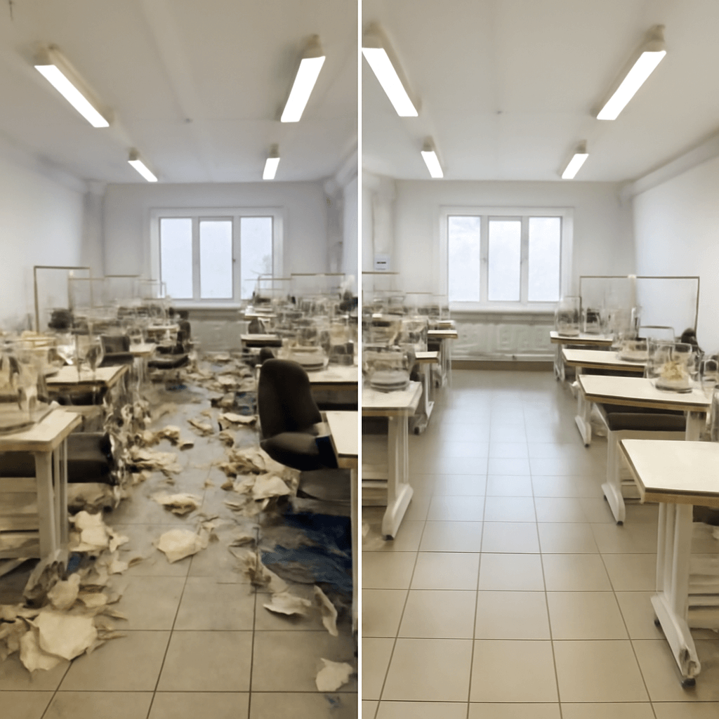 Процесс уборки оптимизирован для минимизации простоя оборудования — мы работаем в ночное время и выходные, без воздействия на производственные процессы.