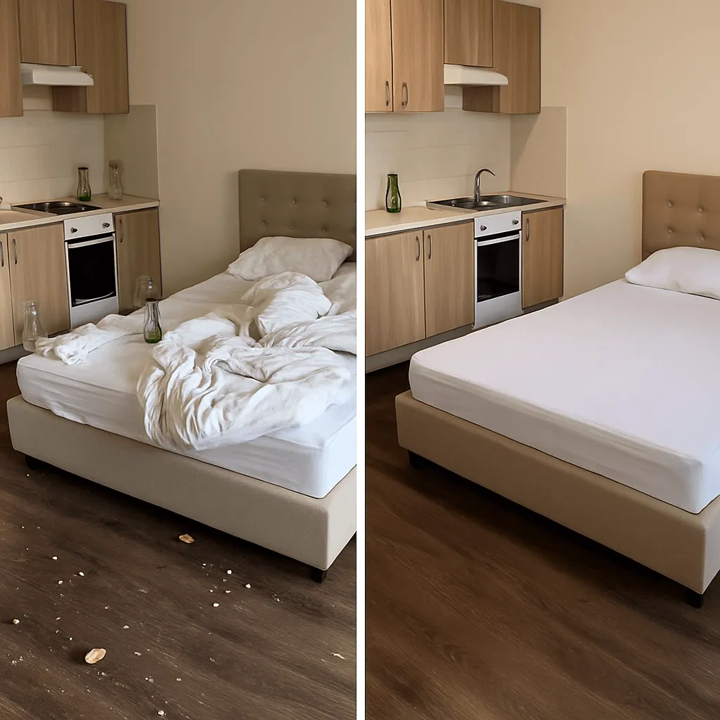 После уборки отправим фото до/после, включая мелочи: мусор, бельё, посуду. По запросу — видеофиксация и полный чек-лист по WhatsApp.