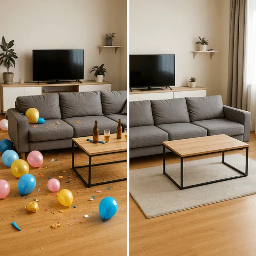 Послепраздничная: конфетти, стаканы, упаковки, крошки, следы напитков на полу и мебели |