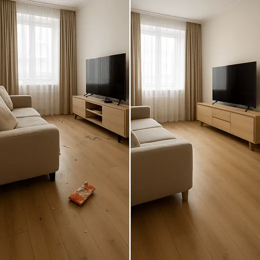 Отправляем 8–12 фото: до и после уборки комнат, кухни, санузлов. Полная прозрачность и контроль качества.